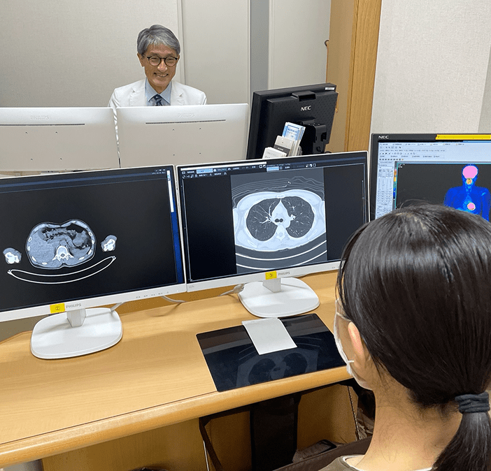 検査終了後は、PET核医学認定医が、画像を見ながらわかりやすく丁寧な説明を行います。「健診当日に結果説明があり、安心できた」「優しく接してくださり、リラックスできた」「説明がわかりやすく、自分の健康状態がわかる、よい機会でした」という声をいただいています。